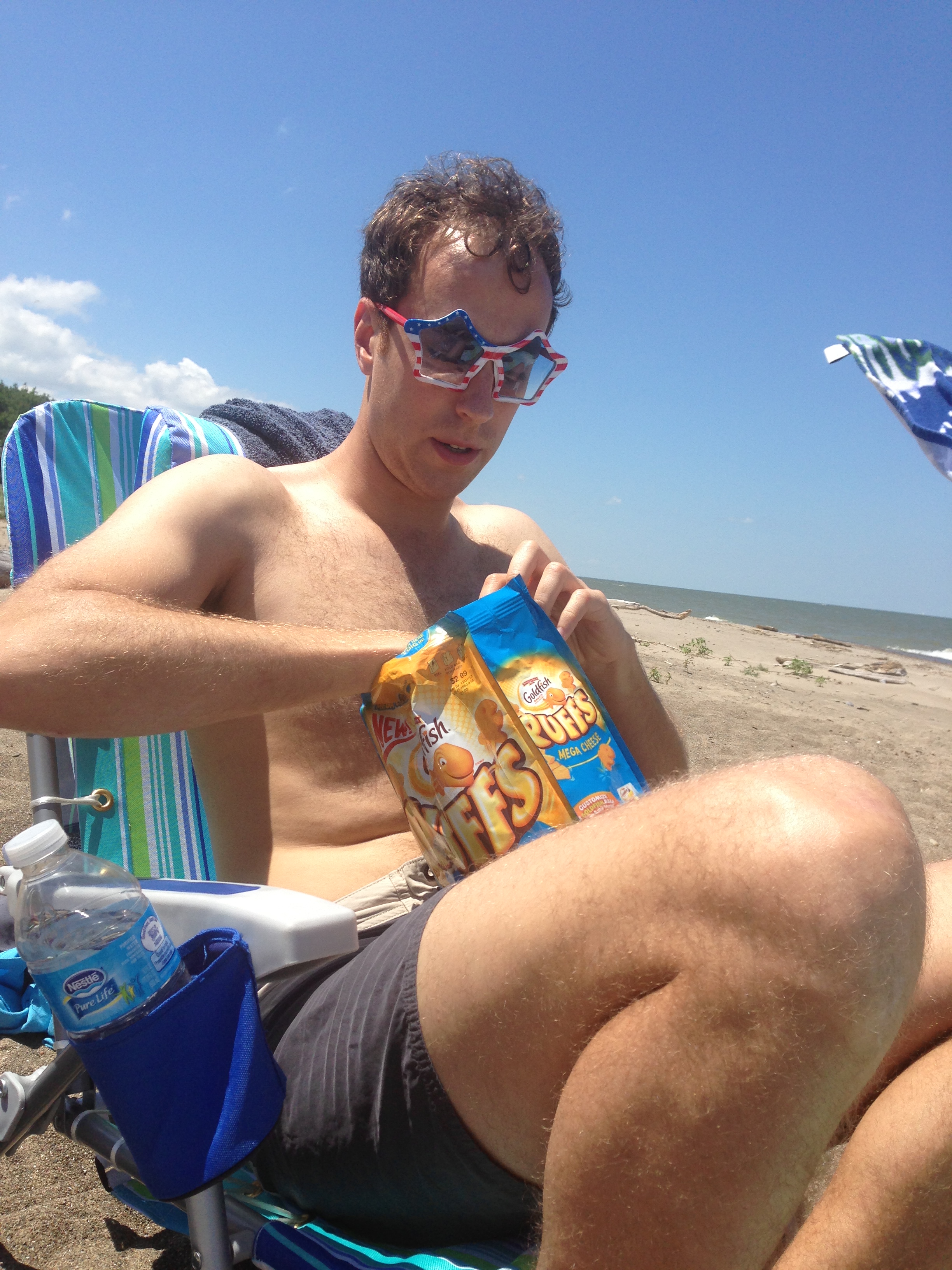 Stunning. And with “mega cheese” as a flavor, we could be in for a wild ride. I resisted the urge to rip them open right there, and instead took them to the counter and paid for them like a civilized member of society. I couldn’t wait to dig into these mofos though. We got home and headed over to the beach, where I donned Erica’s grandma’s American flag star sunglasses for fear of being blinded by the shining glory of these puffs when I gaze my mortal eyes on them for the first time.