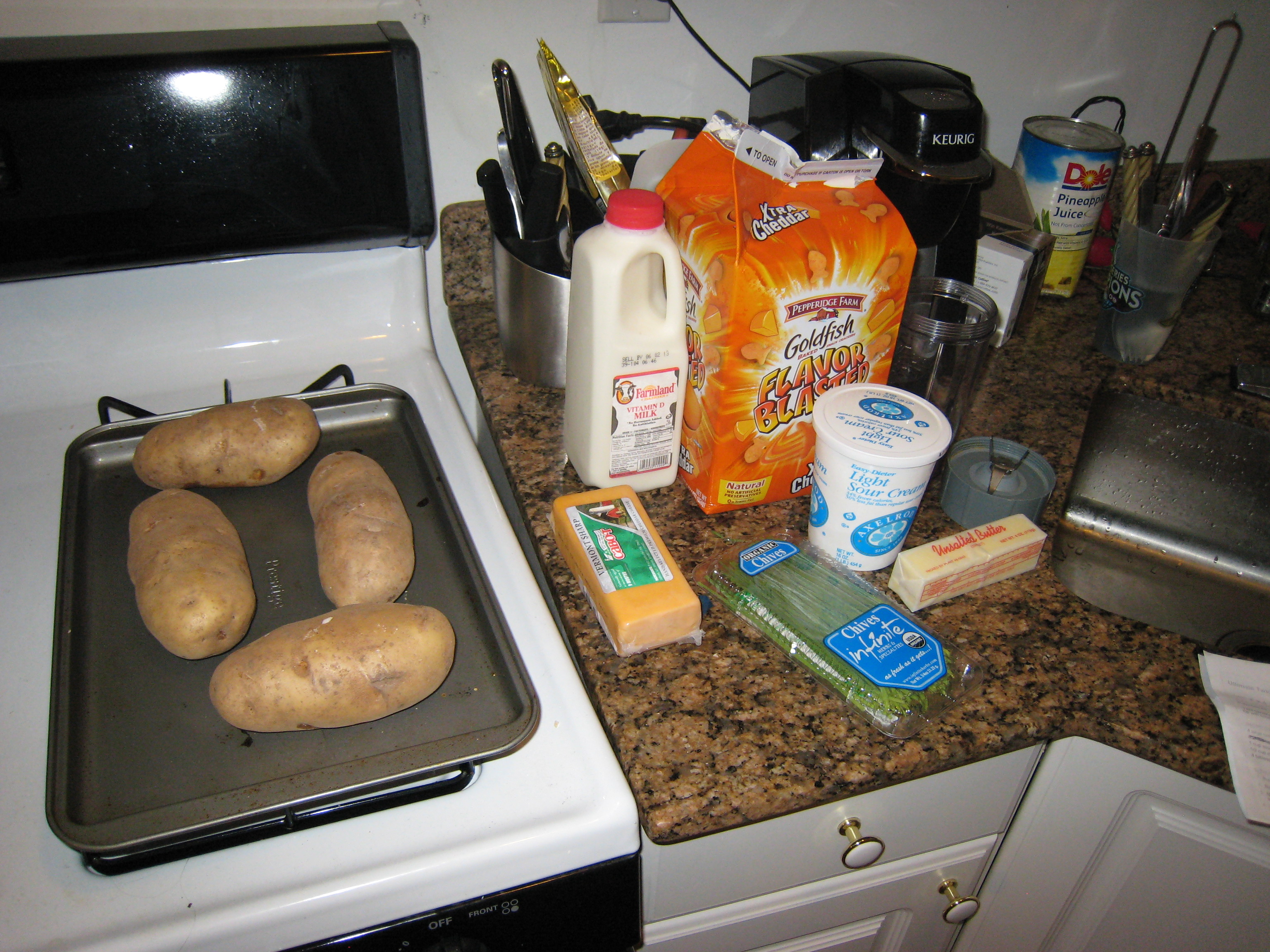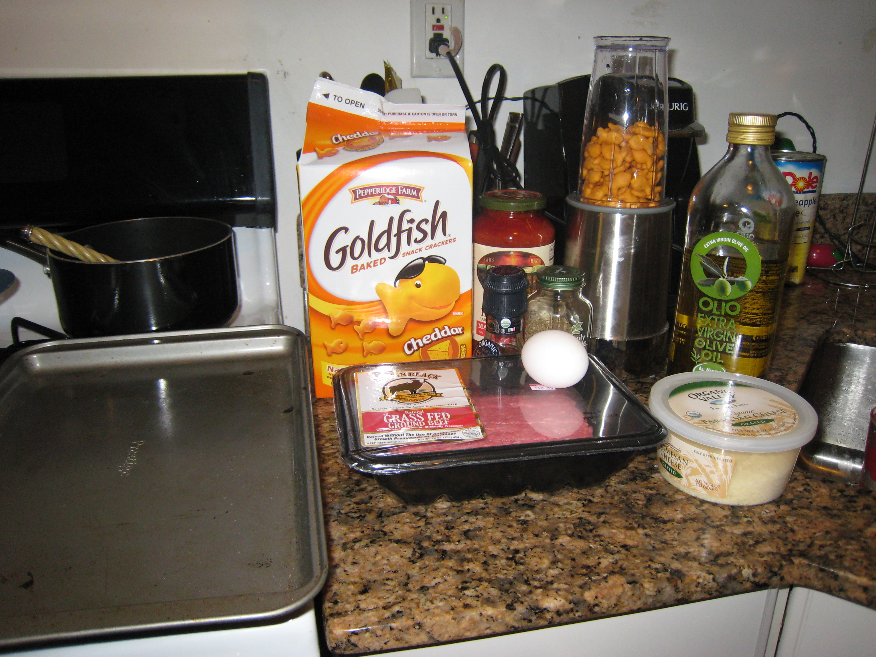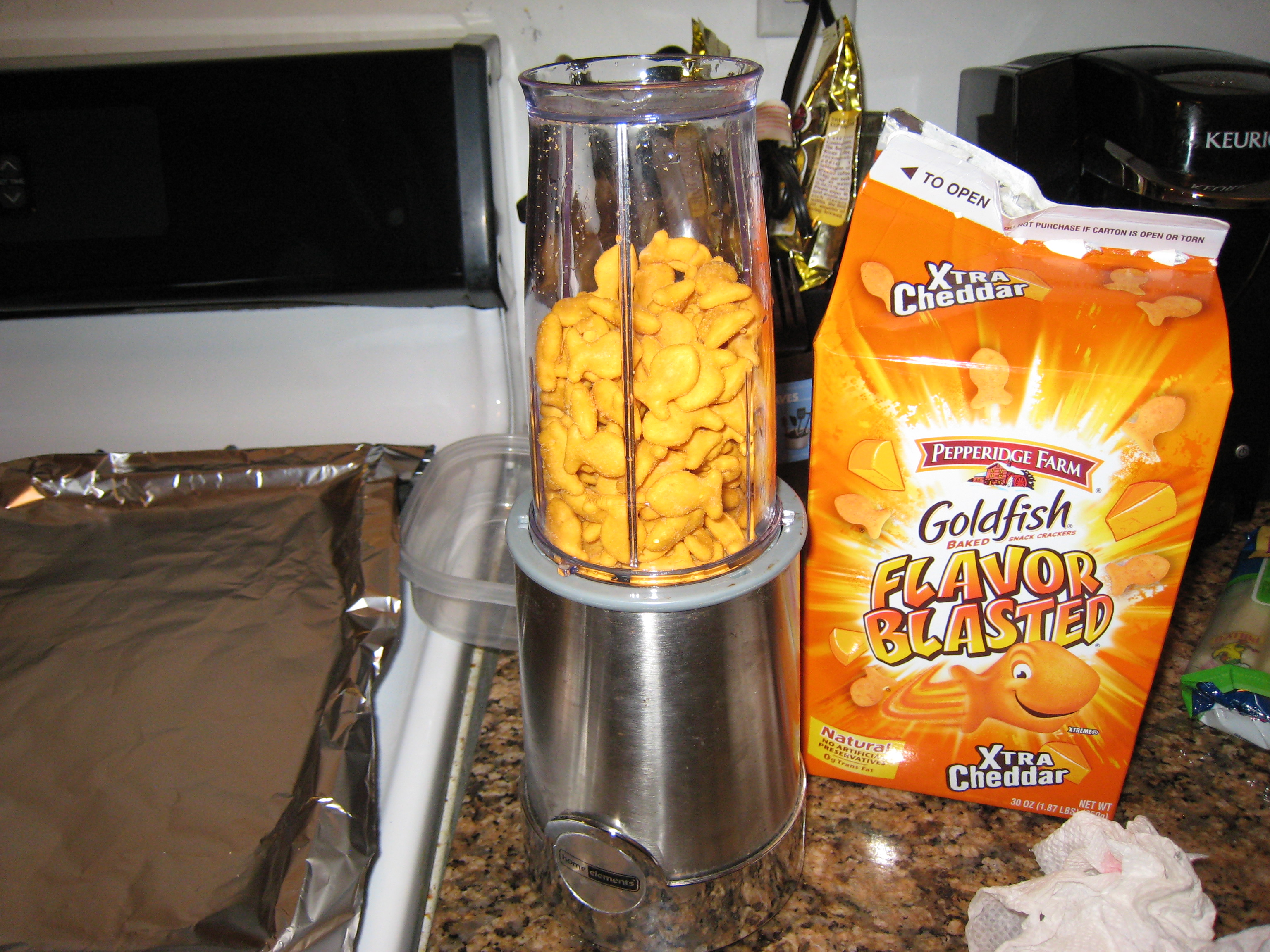 Oh, hi! Your friendly neighborhood Goldfisherman is back after a brief 3.5-year hiatus with a new recipe for all my Goldfishionados! I won’t go into detail about where I’ve been, but I will say that no, I had not Flavor Blasted myself to an early demise, and no, Pepperidge Farm had not sued me for creating unsanctioned and unholy concoctions with their products. I’ve just been busy with life I guess. I’ve moved twice, and as you will see, I STILL have no counter space! That hasn’t prevented me from putting together a delicious new creation for you, right on the edge of the counter and up against the sink, which had a hanging planter in it for some reason.